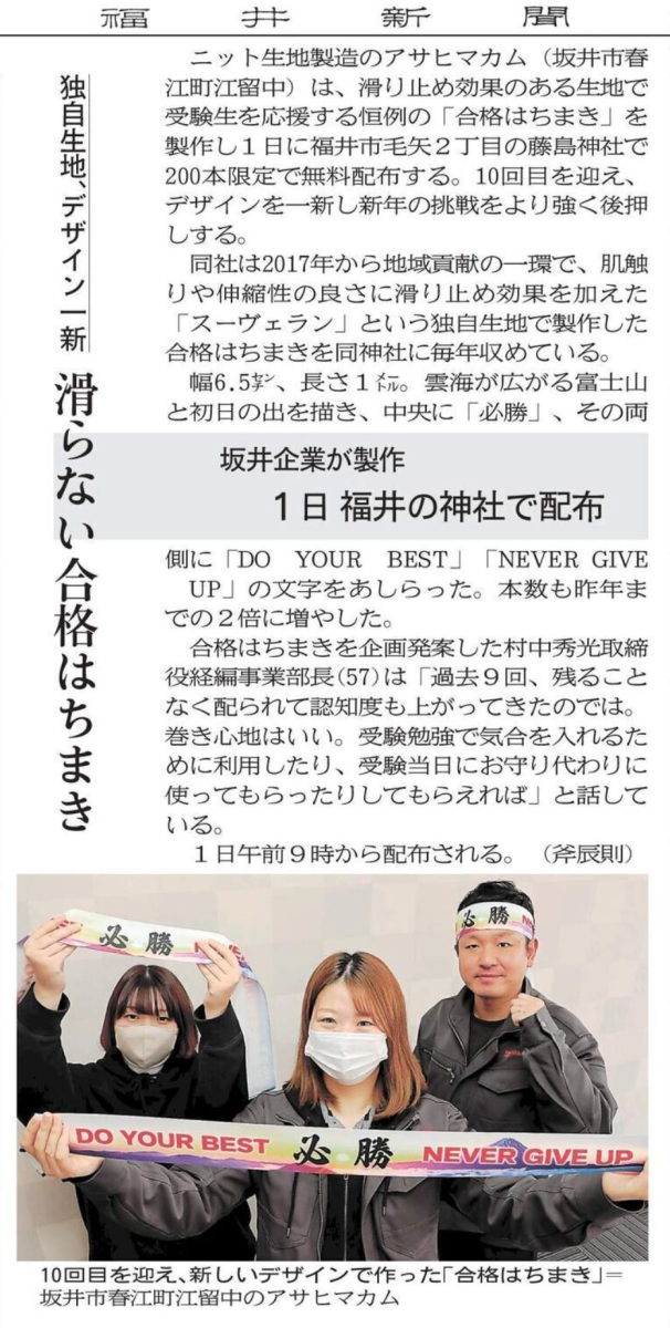 12月29日、『合格はちまき』に関する記事が福井新聞に掲載されました。